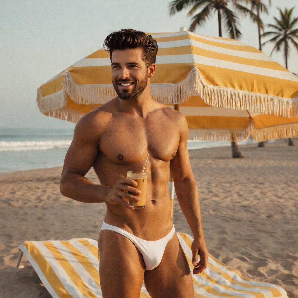 A smiling handsome man wearing a small white bikini swimsuit holding an iced coffee on the beach